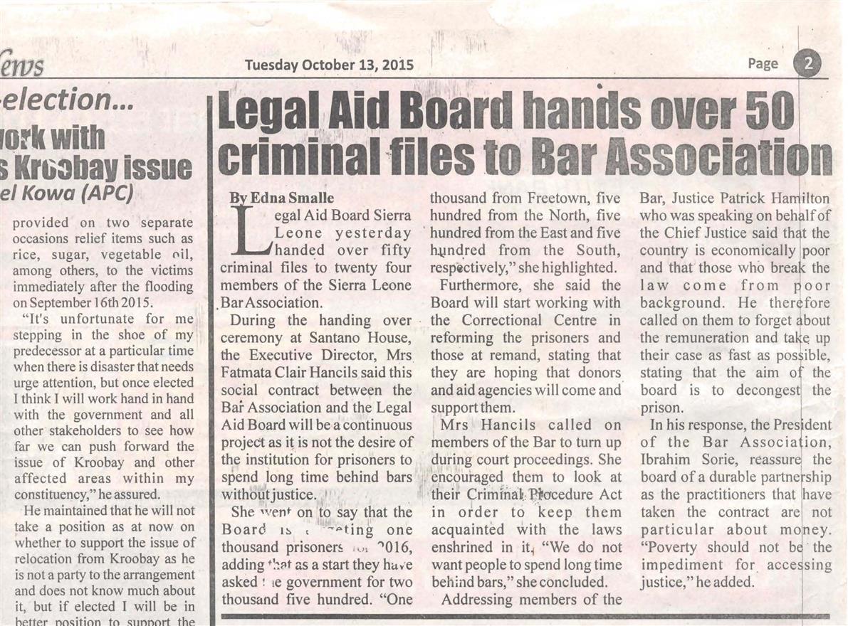 Legal Aid Board Sierra Leone Legal aid is a pivotal element of a fair, humane and efficient criminal justice system that is based on the rule of law. International law and standards are crystal clear on the fact that states should ensure a comprehensive legal aid system that is accessible, effective, sustainable, and credible so that justice can be accessible to all. Sierra Leone is a signatory to the International Covenant on Civil and Political Rights which provides for the right to fair trial and legal aid in Article 14(3) (d). The Sierra Leone Constitution also provides for this right in Sections 23 and 25.  Sierra Leone passed the Legal Aid Act in May 2012, thus establishing the Sierra Leone Legal Aid Board (LAB) which is an independent organ with an objective of providing legal aid nationwide. The Board’s core functions include the provision of legal information and education, provision of legal advice and legal representation in the court of law. Its functions further inc...